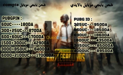 PUBG ID : 325UC---950DA 660UC---1850DA 690UC---1860DA 1800UC---4350DA 3850UC---8500DA 4000UC---8950DA الدفع يكون عن طريق البريد أو بريدي موب او ي