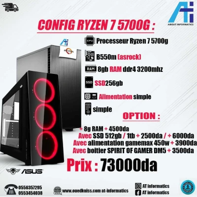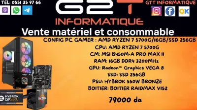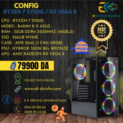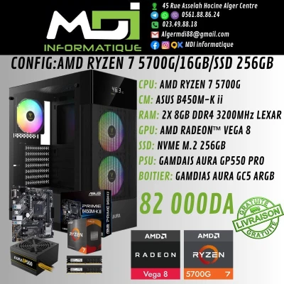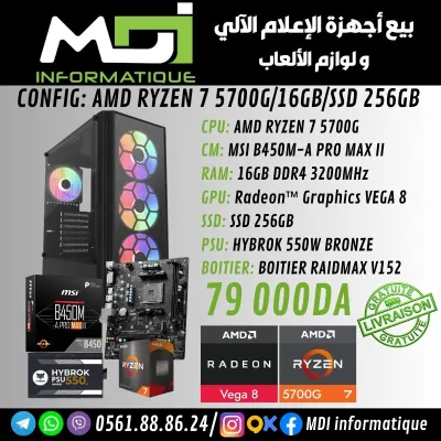 CPU: AMD RYZEN 7 5700G CM: MSI B450M-A PRO MAX II RAM: 16GB DDR4 3200MHz GPU: Radeon™ Graphics VEGA 8 SSD: SSD 256GB PSU: HYBROK 550W BRONZE BOITIER: BOITIER RAIDMAX V152