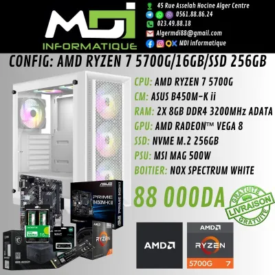 CPU: AMD RYZEN 7 5700G CM: ASUS B450M-K ii RAM: 2X 8GB DDR4 3200MHz ADATA GPU: AMD RADEON™ VEGA 8 SSD: NVME M.2 256GB PSU: MSI MAG 500W BOITIER: NOX SPECTRUM WHITE