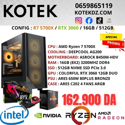 CPU : AMD Ryzen 7 5700X COOLING : DEEPCOOL AG200 MOTHERBOARD: ASROCK B450M-HDV RAM : 16GB (8X2) 3200MHZ DDR4 SSD : 512GB NVME SSD PCIe 3.0 GPU : COLORFUL RTX 3060 12GB DUO PSU : ARES 650W 80