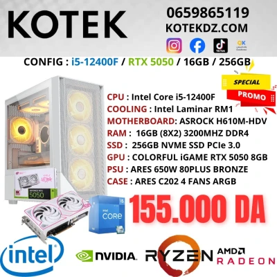 CPU : Intel Core i5-12400F COOLING : Intel Laminar RM1 MOTHERBOARD: ASROCK H610M-HDV RAM : 16GB (8X2) 3200MHZ DDR4 SSD : 256GB NVME SSD PCIe 3.0 GPU : COLORFUL iGAME RTX 5050 8GB PSU : AR