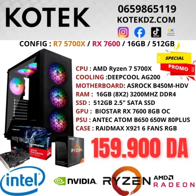 CPU : AMD Ryzen 7 5700X COOLING :DEEPCOOL AG200 MOTHERBOARD: ASROCK B450M-HDV RAM : 16GB (8X2) 3200MHZ DDR4 SSD : 512GB 2.5" SATA SSD GPU : BIOSTAR RX 7600 8GB OC PSU : ANTEC ATOM B650 6
