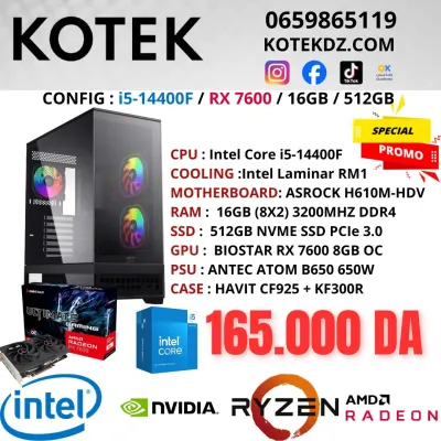 CPU : Intel Core i5-14400F COOLING :Intel Laminar RM1 MOTHERBOARD: ASROCK H610M-HDV RAM : 16GB (8X2) 3200MHZ DDR4 SSD : 512GB NVME SSD PCIe 3.0 GPU : BIOSTAR RX 7600 8GB OC PSU : ANTEC A