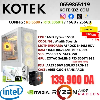 CPU : AMD Ryzen 5 5500 COOLING : Wraith Stealth MOTHERBOARD: ASROCK B450M-HDV RAM : 16GB (8X2) 3200MHZ DDR4 SSD : 256GB 2.5" SATA SSD GPU : ZOTAC GAMING RTX 3060Ti 8GB