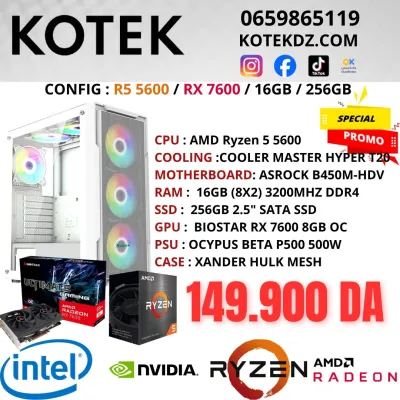 CPU : AMD Ryzen 5 5600 COOLING :COOLER MASTER HYPER T20 MOTHERBOARD: ASROCK B450M-HDV RAM : 16GB (8X2) 3200MHZ DDR4 SSD : 256GB 2.5" SATA SSD GPU : BIOSTAR RX 7600 8GB OC PSU : OCYPUS BE