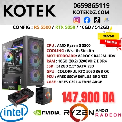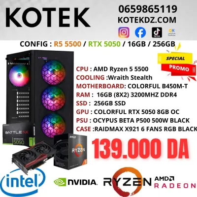CPU : AMD Ryzen 5 5500 COOLING :Wraith Stealth MOTHERBOARD: COLORFUL B450M-T RAM : 16GB (8X2) 3200MHZ DDR4 SSD : 512GB NVME SSD PCIe 3.0 GPU : iGAME RTX 5050 8GB ULTRA OC PSU : OCYPUS BET