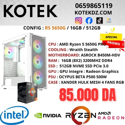 CPU : AMD Ryzen 5 5650G PRO / 5600G COOLING : Wraith Stealth MOTHERBOARD: ASROCK B450M-HDV RAM : 16GB (8X2) 3200MHZ DDR4 SSD : 512GB NVME SSD PCIe 3.0 GPU : GPU integre : Radeon Graphics P