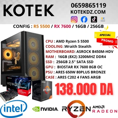CPU : AMD Ryzen 5 5500 COOLING :Wraith Stealth MOTHERBOARD: ASROCK B450M-HDV RAM : 16GB (8X2) 3200MHZ DDR4 SSD : 256GB 2.5" SATA SSD GPU : BIOSTAR RX 7600 8GB OC PSU : ARES 650W 80PLUS B
