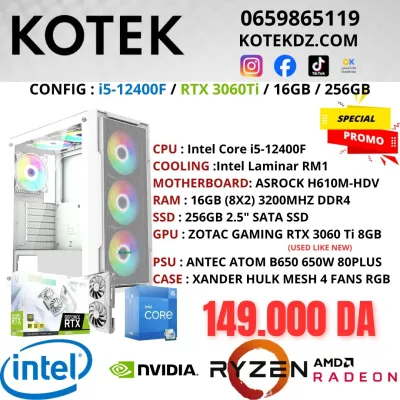 CPU : Intel Core i5-12400F COOLING :Intel Laminar RM1 MOTHERBOARD: ASROCK H610M-HDV RAM : 16GB (8X2) 3200MHZ DDR4 SSD : 256GB 2.5" SATA SSD GPU : ZOTAC GAMING RTX 3060 Ti 8GB