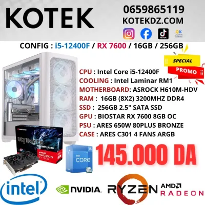 CPU : Intel Core i5-12400F COOLING : Intel Laminar RM1 MOTHERBOARD: ASROCK H610M-HDV RAM : 16GB (8X2) 3200MHZ DDR4 SSD : 256GB 2.5" SATA SSD GPU : BIOSTAR RX 7600 8GB OC PSU : ARES 650W 80