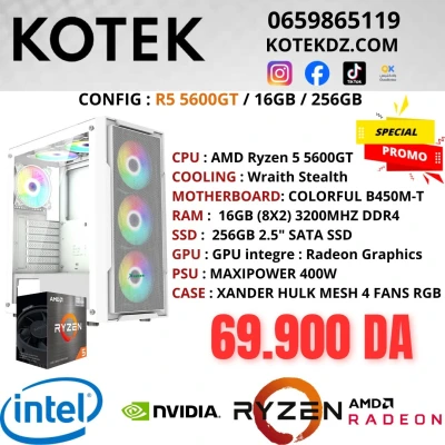 CPU : AMD Ryzen 5 5600GT 5600G COOLING : Wraith Stealth MOTHERBOARD: COLORFUL B450M-T RAM : 16GB (8X2) 3200MHZ DDR4 SSD : 256GB 2.5" SATA SSD GPU : GPU integre : Radeon Graphics PSU : MAXI