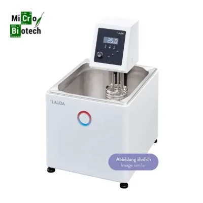 Bain thermostaté réfrigéré LAUDA de laboratoire, conçu pour un contrôle précis de la température de -25 à 100 °C. Il inclut un couvercle de bain et un raccord de pompe pour un refr
