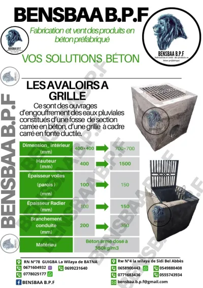 🧱 Vente de Regards & Avaloirs en Béton Armé – SNC SUBP SADOUDI 🧱 La société SNC SUBP SADOUDI vous propose une gamme complète de regards et avaloirs en béton armé, spécialeme