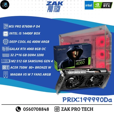 PROCESSEUR : INTEL I5 14400F (10C,16T) REFROIDISSEMENT : DEEP COOL AG 400W ARGB MÉMOIRE : 32 2*16 GB DDR4 3200MHz LEXAR CARTE MÈRE : MSI PRO B760M-P D4 STOCKAGE : M2 512 GB SAMSUNG GEN 4