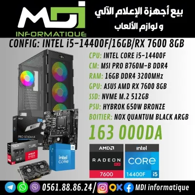 CPU: INTEL CORE i5-14400F CM: MSI PRO B760M-B DDR4 RAM: 16GB DDR4 3200MHz GPU: ASUS AMD RX 7600 8GB SSD: NVME M.2 512GB PSU: HYBROK 650W BRONZE BOITIER: NOX QUANTUM BLACK ARGB
