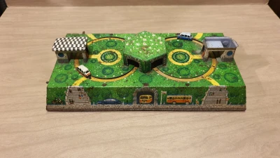 circuit de voitures miniatures vintage en tôle, des années 1950 à 1960. Jouet à remontoir possède une carrosserie imprimée en lithographie et deux circuits circulaires. Jouet connu