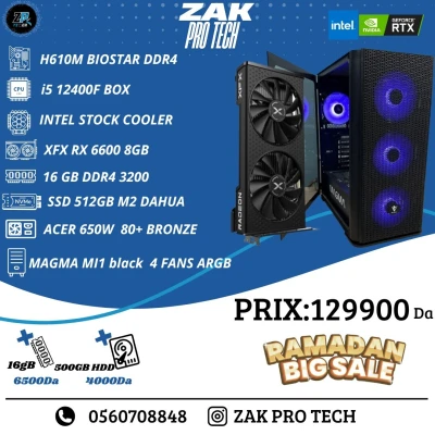 GAMING PC : i5-12400F/16GB/AMD RX6600 8GB CPU: INTEL COREE i5-12400F CM: BIOSTAR H610 RAM: 16GB DDR4 3200MHz team groupe GPU:XFX RX 6600 8GB SSD: 512 GB PSU: acer 650W 80+ bronze Full Mod