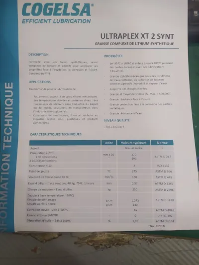ULTRAPLEX XT 2 SYNT graisse complexe de lithium synthétique , savon .......... voire fiche technique sur les photo