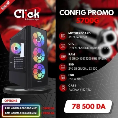 ✅ CPU: RYZEN 7 5700G ✅ CARTE MERE: B450 M-K ASUS ✅ RAM: 16GB RAM CORSAIR ✅ SSD: 512 SSD HIKSEMI ✅ ALIMENTAION: 550W RAIDMAX ✅ BOITIER: RAIDMAX V216 TBS