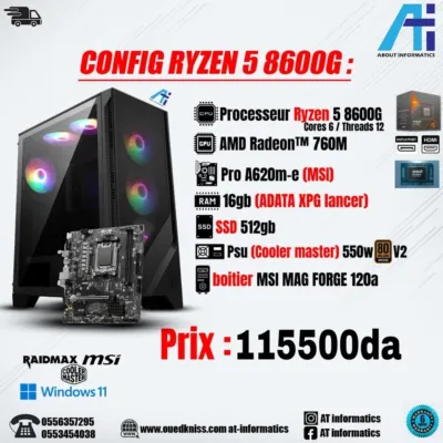 Config : Ryzen 5 8600G Ai Ram 16 GB ddr 5 / 68000 hz SSD 512 Gb RTX 3060 12 GB Écran MSI IPS 180 hz 27 P Alimentation 750 W Gold Boite Ultra Gaming RGB La souris Logitech héro Casque Gami