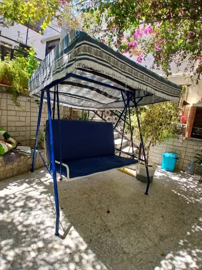 Avec par soleil 3 personne ou plus Coussin en toil Dossier de la balencoir reglable a chaines Couleur bleu et blanc Tres confortable Enormement solide construit a base de tube galvanisée