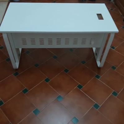 bureau blanc en excellent état, idéal pour le télétravail, les études ou une chambre. Plateau large et propre, avec ouverture intégrée pour le passage des câbles. Pieds en métal de