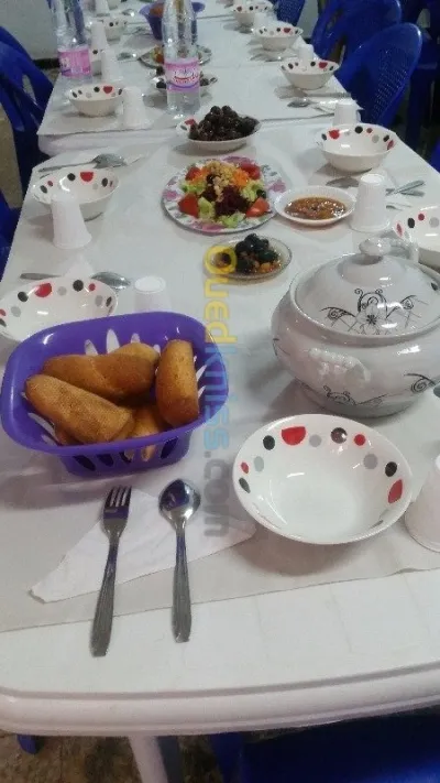 Service complet pour location . 100 personne . 100 bol à chorba 100 assiettes creuses 100 fourchette et 100 cuillères 15 panier à pain 10 soupière 12 grand plate ovale pour salade