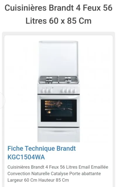 Cuisinières Brandt 4 Feux 56 Litres Email Emaillée Convection Naturelle Catalyse Porte abattante Largeur 60 Cm Hauteur 85 Cm