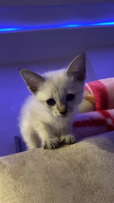 Une chat Shiraz ،20jour , bonne santé et adore jouer trop funny et cute. Elle a une fourrure grise et blanche et de très beaux yeux bleus💕🍒.