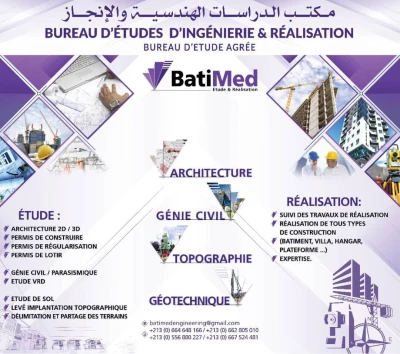 🏗️ Batimed – Bureau d’Études & Réalisation Agréé 📍 Services professionnels en ingénierie, architecture et construction Nos prestations : ✅ Architecture 2D / 3D ✅ Permi