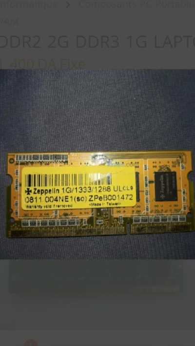 Barette de RAM occasion pour PC de bureau : -DDR3 8 Go à 1600 MHz avec dissipateur thermique Kingston : 4500 DA -DDR2 2Go à 800 MHz : 2000 DA -DDR1 1 Go à 133 MHz Kingston : 500 DA Baret