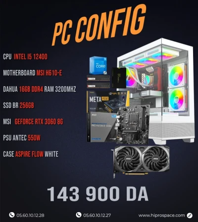 Unite Gamer Intel I5 12400 /CM MSI H610-E /DDR4 16G 3200Mhz / SSD 256 GB/Carte Graphique GEFORCE RTX 3060 8G/ PSU 550W / Case NOX ASPIR FLOW full White plus 6Pcs Fan 12cm ARGB + Controller 1