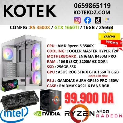 CPU : AMD Ryzen 5 3500X COOLING :COOLER MASTER HYPER T20 MOTHERBOARD: ENIGMA B450M PRO RAM : 16GB (8X2) 3200MHZ DDR4 SSD : 256GB SSD GPU : ASUS ROG STRIX GTX 1660 TI 6GB