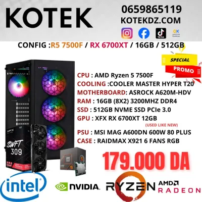 CPU : AMD Ryzen 5 7500F COOLING :COOLER MASTER HYPER T20 MOTHERBOARD: ASROCK A620M-HDV RAM : 16GB (8X2) 3200MHZ DDR4 SSD : 512GB NVME SSD PCIe 3.0 GPU : XFX RX 6700XT 12GB