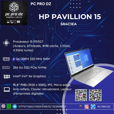HP Pavilion 15 ✅ CPU: Processeur i5-1155G7 (4 cœurs, 8 threads, 8 Mo cache, 2.5 GHz, 4.5 GHz turbo) ✅ RAM: 8 Go DDR4 3200 MHz ✅ Stockage: 256 Go SSD PCIe NVMe ✅ GPU: Intel® Iris