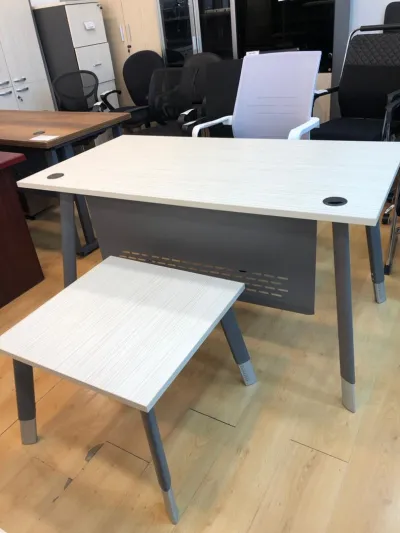 BUREAU MÉLAMINÉ AVEC PIÉTEMENT MÉTALLIQUE AJUSTABLE AVEC CA TABLE BASSE . Caractéristiques principales : Bureau : Plateau en mélaminé de haute qualité, résistant aux rayures et f