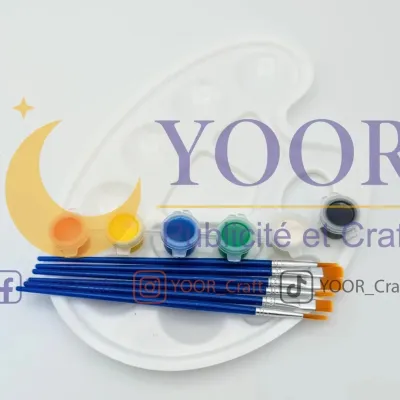 طقم أدوات رسم متكامل يحتوي على لوحة لخلط الألوان، 6 فرشات للرسم، و6 ألوان أساسية في علب صغيرة. مثالي للمبت