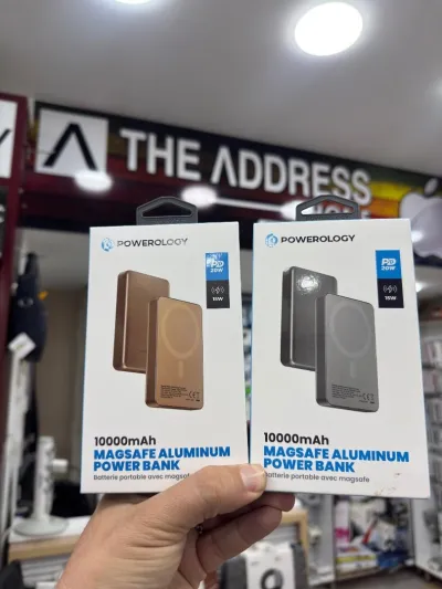 Powerology Power Bank 10 000 mAh avec charge PD 20 W et MagSafe 15 W. Ce modèle offre une grande capacité de batterie (10 000 mAh) ainsi que des sorties USB-C et sans-fil. Pour la charge v