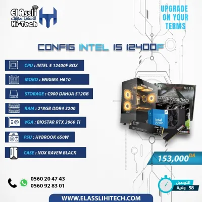 La configuration est dotée d’un processeur Intel i5 12400F, une carte mère Enigma H610, un stockage SSD C900 de 512 Go, une RAM Dahua 2x8 Go DDR4 3200 Hz, une carte graphique MSI RTX 305