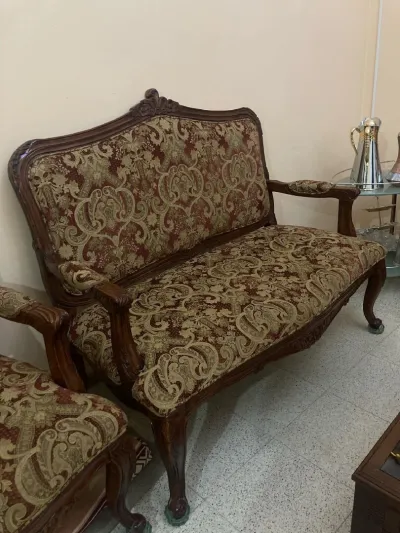 Salon ancien à vendre Ensemble raffiné composé d’un canapé 2 places et d’un fauteuil assorti. Bois massif sculpté à la main, tissu à motifs baroques rouges et dorés. Pièces uniq