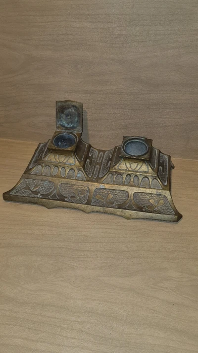 Superbe encrier de bureau double, datant de la fin du XIXe ou du début du XXe siècle. Confectionné en bronze massif, cet objet présente un design richement orné, mêlant les influences