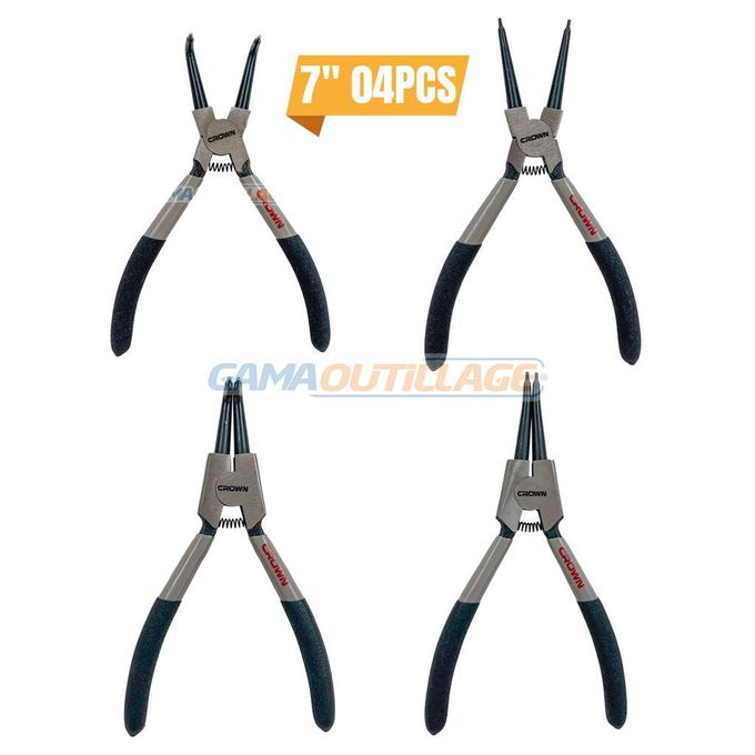 JEUX PINCE CIRCLIPS 7″ 04PCS CROWN , est un ensemble d’outils polyvalent qui permet de travailler avec des circlips de différentes types. Il est composé de quatre pinces différentes.
