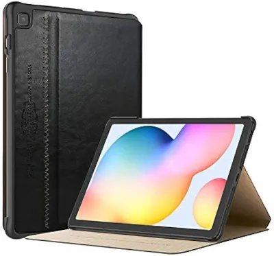 Cet étui portefeuille a un rabat de protection qui protège l'écran de la tablette lorsqu'il n'est pas utilisé et est fixé avec une large sangle élastique, à l'intérieur de l'étui, l
