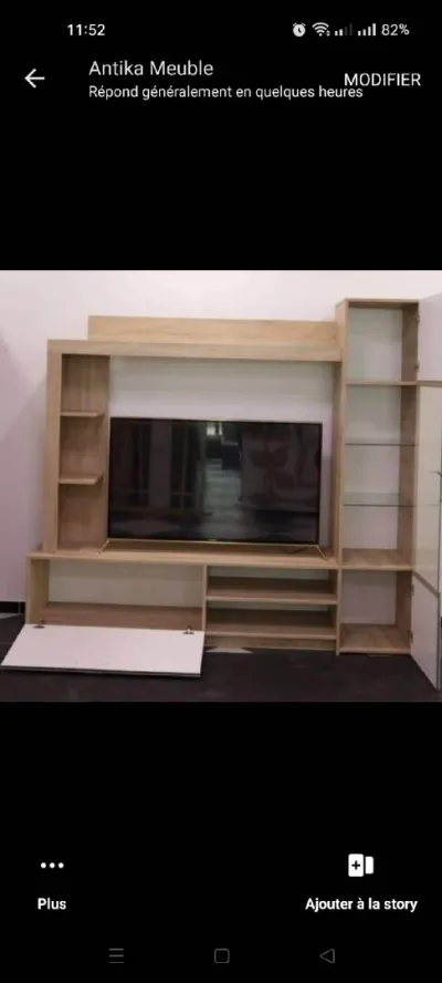 Living - meuble avec étagères et espaces de rangement, pouvant accueillir TV tous formats, vitrage fumé