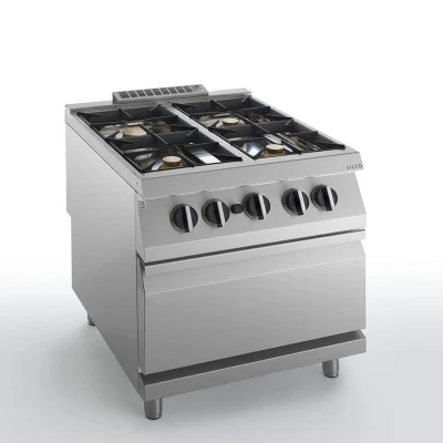 La cuisinière à gaz 4 feux sur four gaz GN 2/1 de la marque Silko est un équipement destiné à la cuisine professionnelle, offrant à la fois des foyers à gaz pour la cuisson et un four