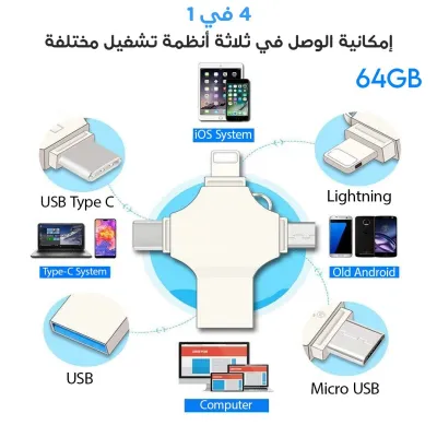 La clé USB multifonctionnelle 4 EN 1 s'adapte à tous vos appareils avec 4 ports : Le connecteur Flash est destiné aux appareils iOS ; le connecteur Micro USB est destiné aux téléphones