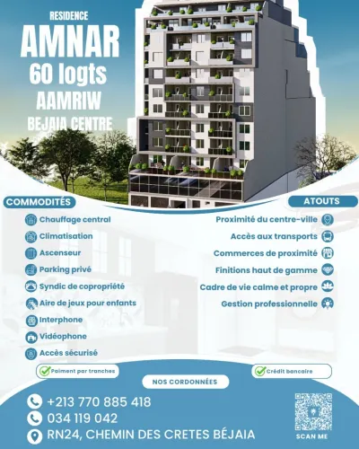 🏗️ RÉSIDENCE AMNAR – Béjaïa 📍 À seulement 5 minutes du centre-ville, la Résidence Amnar vous propose des logements haut standing, pensés pour votre confort et votre sécurit�