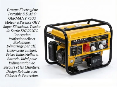 Moteur à essence OHV Tension de sortie : 380V/220V (triphasé et monophasé) Démarrage par clé Disjoncteur intégré Batterie incluse Design "Super Silent" (super silencieux) C'est un gé