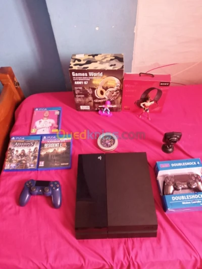 Je veux voir une PS4 avec avec 10 jeux 2 casques un pour gamer et l'autre pour écouter de la musique dans Spotify les jeux FIFA 20 Resident evil 7 Resident evil 3 Uncharted doom assassin's