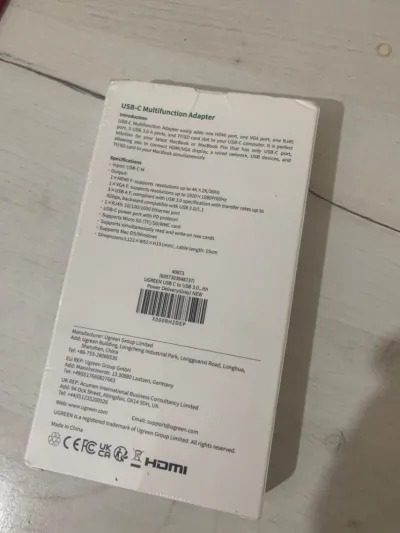 Marque: UGREEN Modèle: CM498/CM179 Nom du produit: HUB USB C multifonction Port HDMI: écran HDR 4K @ 30Hz, 3D Port RJ45:1000/100/10 Mbps Port SD/TF: 104 Mo/s Port PD: PD 100W (PD3.0 20V5A)